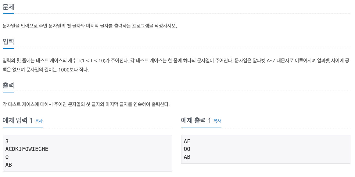 3. 각 테스트 케이스에 대해서 주어진 문자열의 첫 글자와 마지막 글자를 연속하여 출력한다.