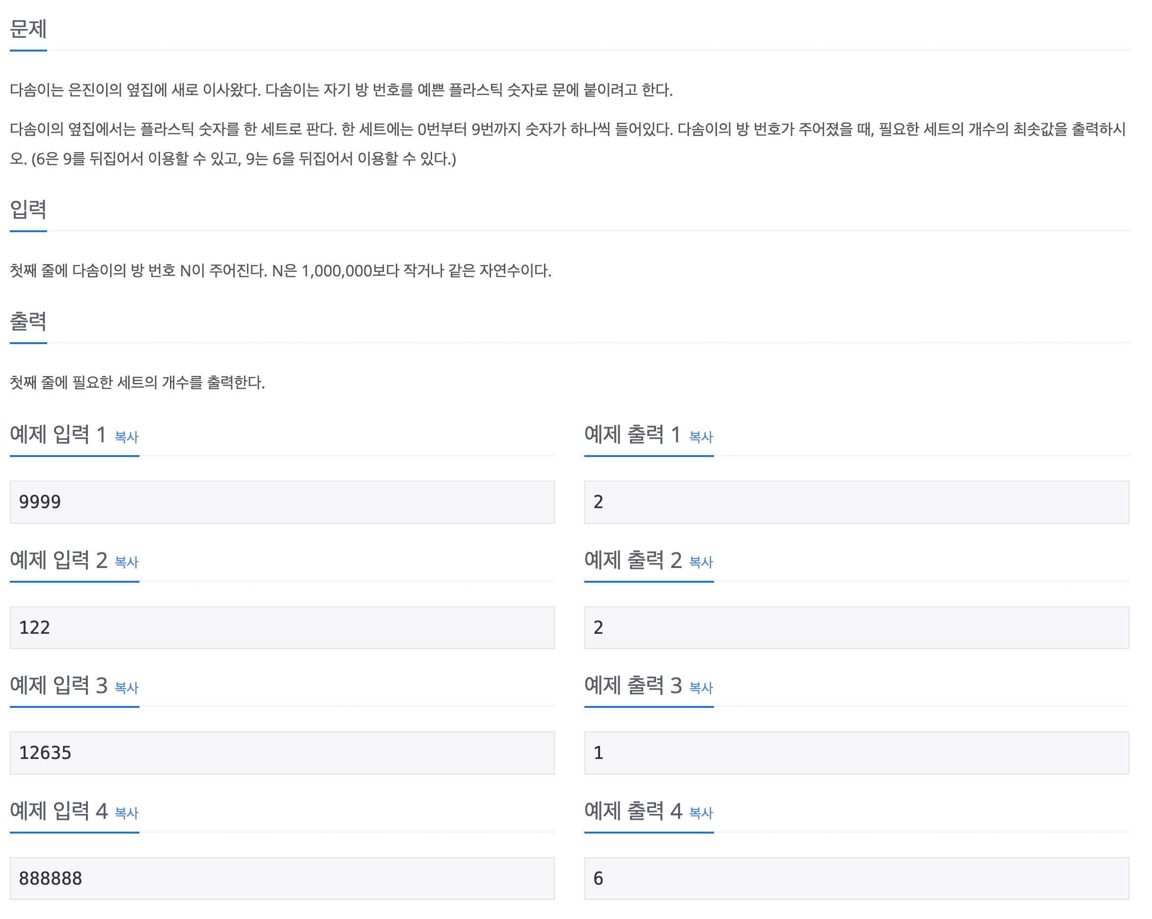 이번에 풀 문제는 1457번, 방 번호 라는 제목을 가진 문제였다. 자세한 내용은 아래와 같다.